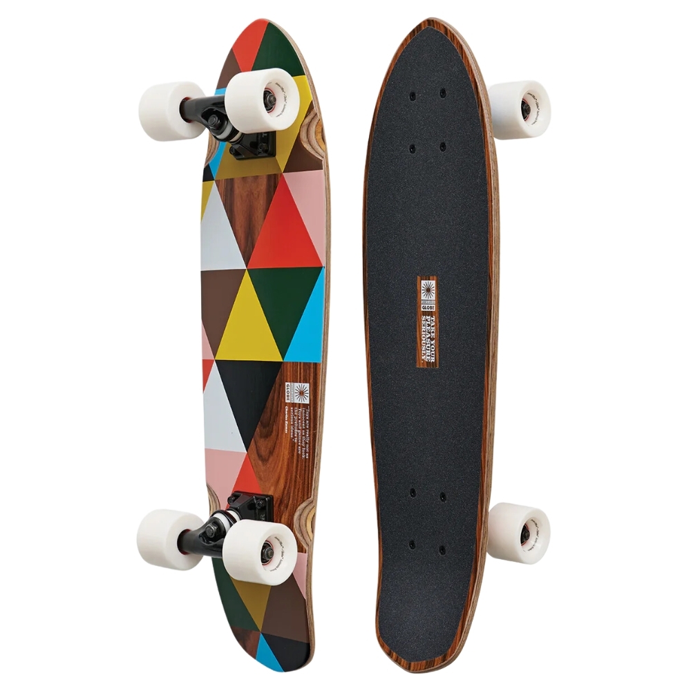 Mini diamond-tail cruiser with soft conical wheels. The Blazer 26" in Eames/Play features mellow concave with kicktail and is constructed from Rosewood + Resin-7 hard rock maple.