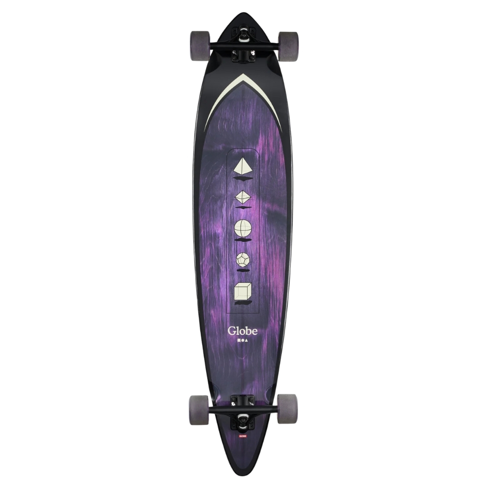 A full length flexy pintail, great for carving The Pintail 44 in Purple/Shape Faze is a classic pintail longboard constructed with Resin-7 hard rock maple with cambered flex and a mellow side to side concave, 180mm Slant reverse kingpin trucks and 70mm 78a wheels. Also features black die-cut griptape with top print and dye washed veneers.