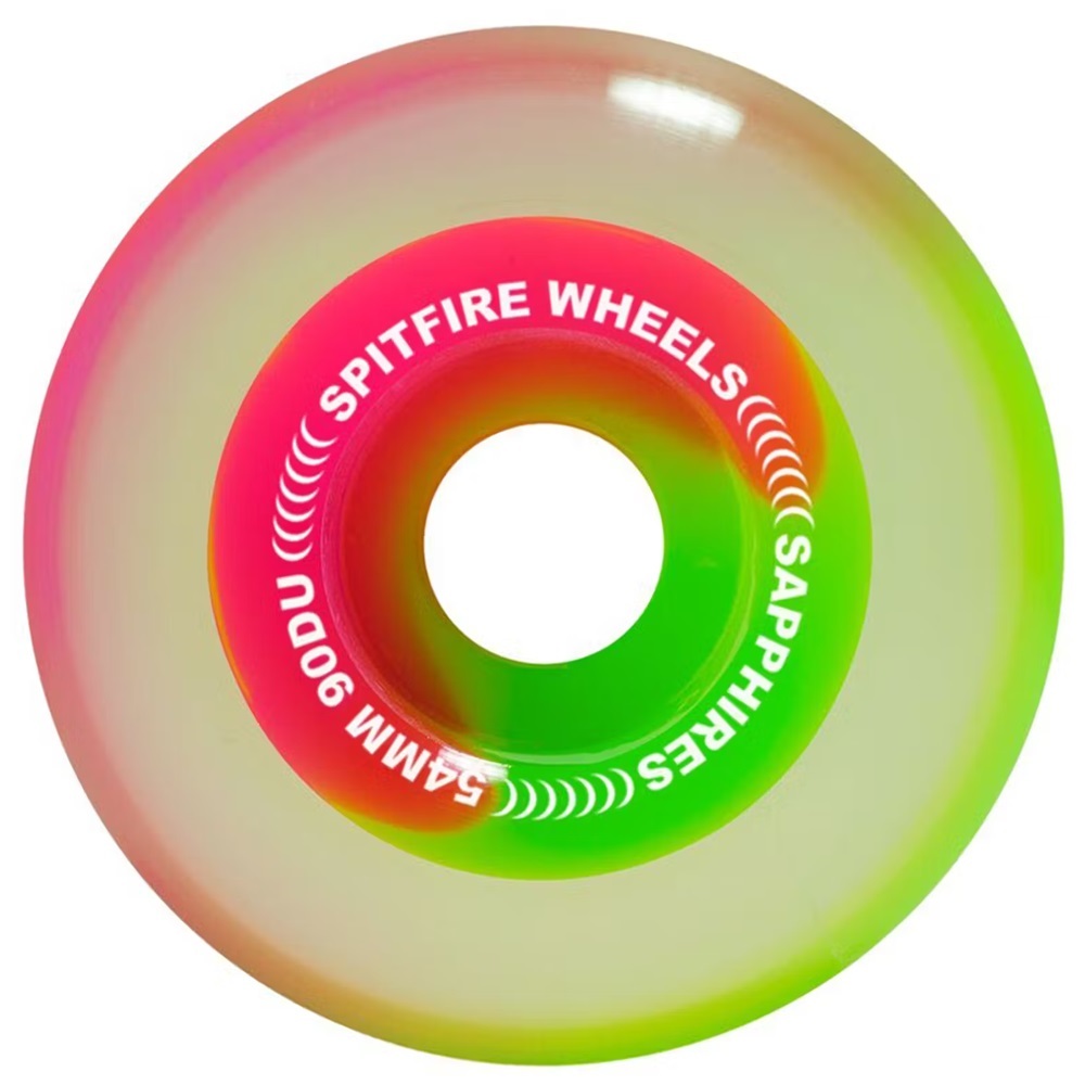 Introducing Spitfire's newest soft 90 Duro cruiser wheels, the Sapphires. A newly developed 90DU clear riding surface, bonded to a 101DU Formula Four inner core, gives you fast, smooth, long-lasting speed wherever you choose to burn.