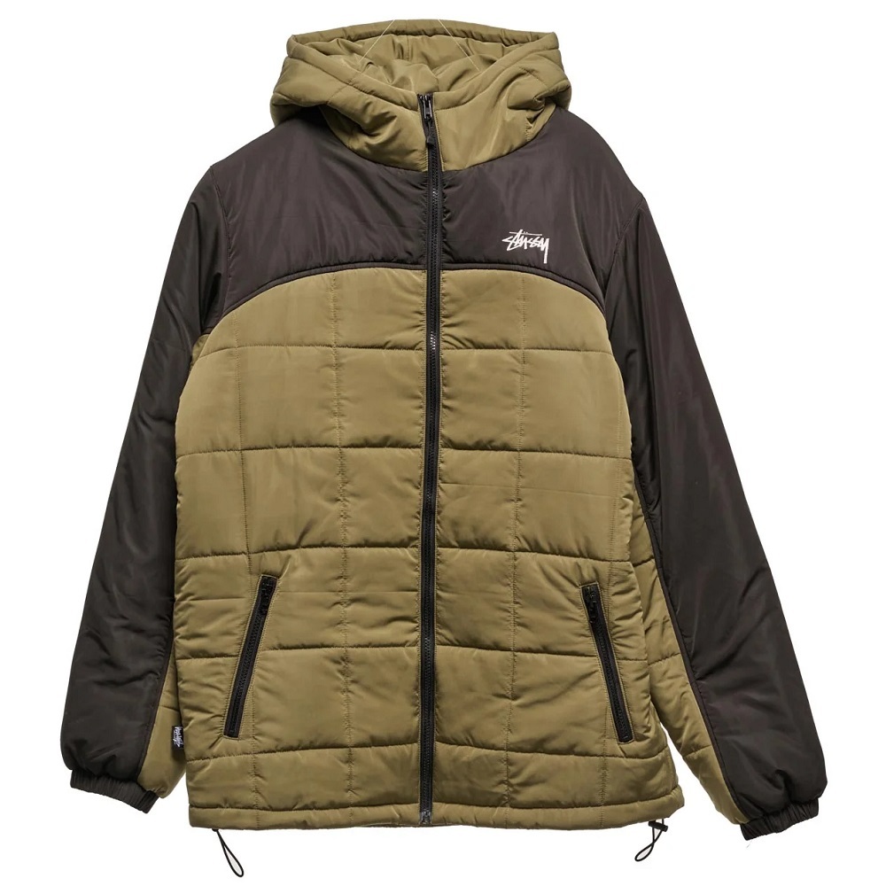 The Stussy Hooded Square Puffa Jacket in Khaki/Black is a men's quilted and wadded jacket with stand collar, embroidered logo at left chest, and welt pockets at hips. Cuffs and hem are finished with internal elastic.