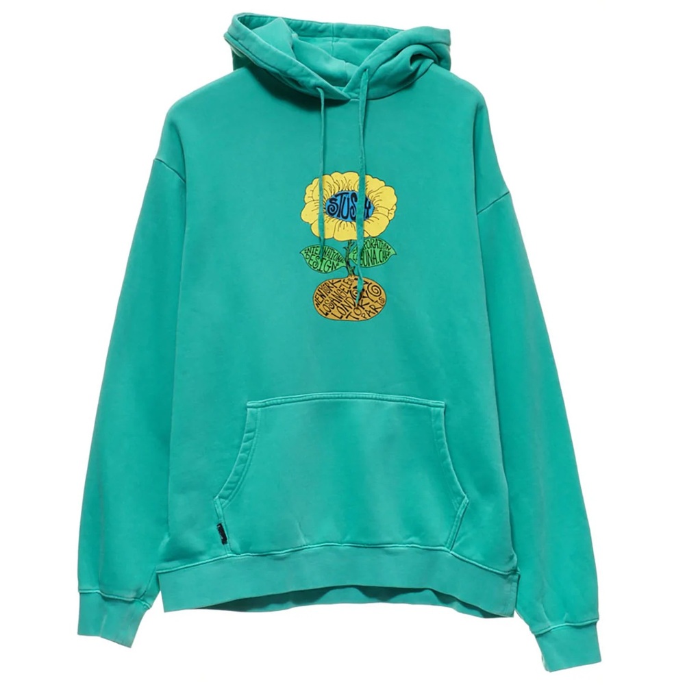 The Stussy Sunflower 50/50 Hood in Pigment Black is a men's hoodie constructed from 50% Cotton/50% Recycled Cotton Fleece. Featuring hood with drawcord, screen-printed logo at front chest & kanga pocket. Finished with rib knit cuffs and hem.