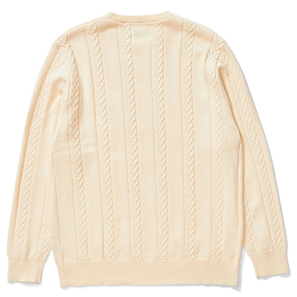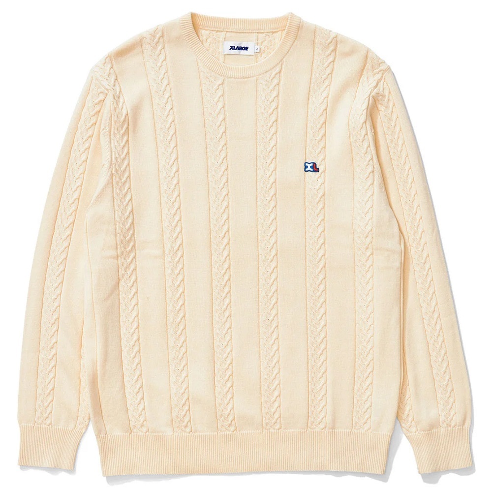 The Xlarge Cable Knit Sweater in Off White is a combed cotton sweater with cable knit detailing. The sweater has rib detailing on the cuffs, neckline, and hem band. Featuring an embroidered patch at the left chest. Made from 100% cotton.